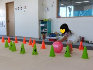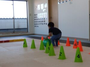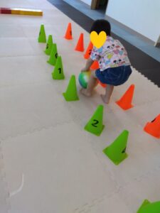 ナンバーコーンの間を縫ってボールを転がします♬