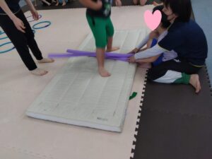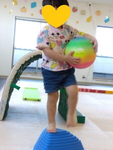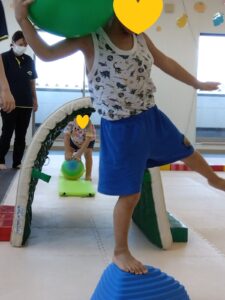 平均台の上に乗りボールと一緒に落ちないように進みました😊