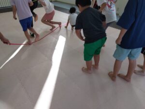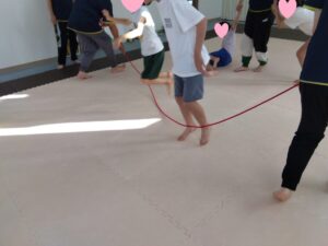 上や下からくる大繩をしゃがんだり、ジャンプをして避けました!