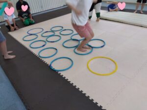 障害物に当たらないように青から黄色のフープまで決められた回数でゴールします🚩