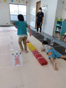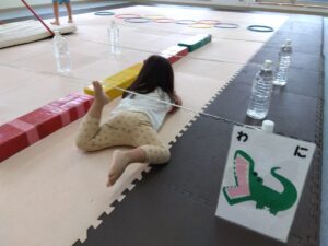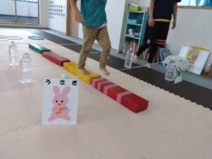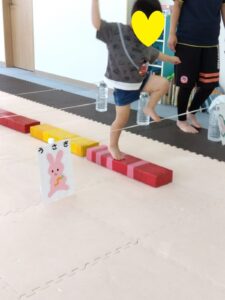 ワニさんでゴムをくぐったら、戻ってきて一本橋渡りをして、ウサギさんで進んで行きます◎
