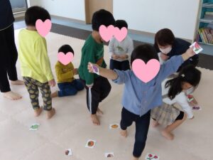 動物さんに変身をして真ん中にある果物カードを取りに行きます♬