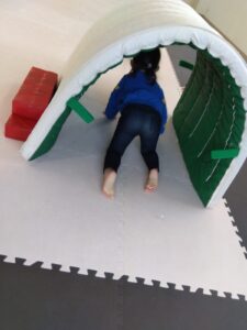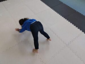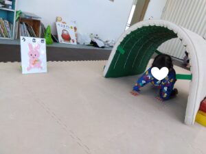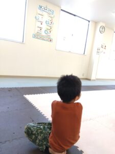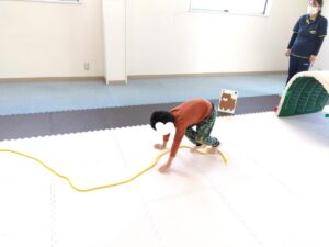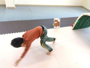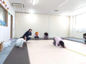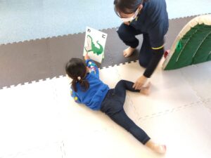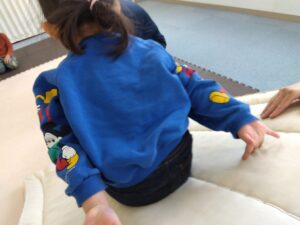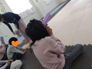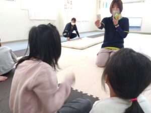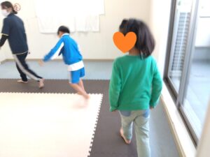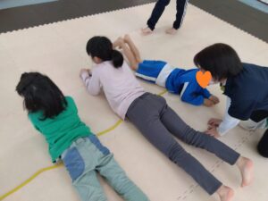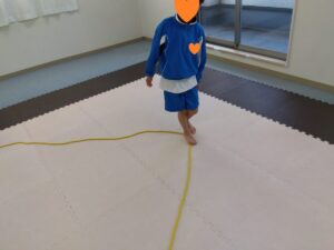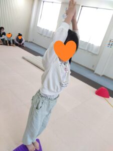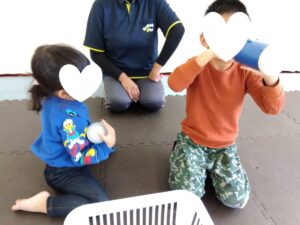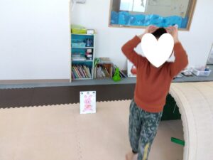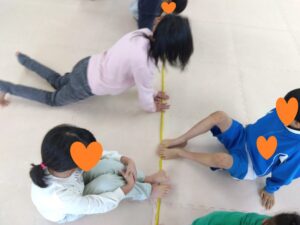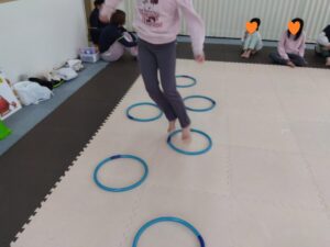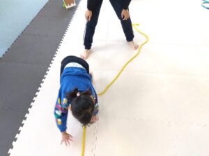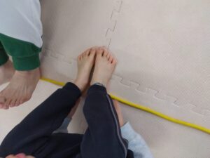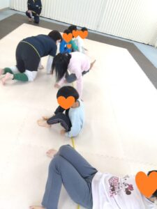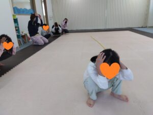 タンバリンの音に合わせて、走ったり 歩いたり ゆっくり大股歩きしたり 急に反対周りになったり… 雷の音が聞こえたら 落ちないように両手で頭を守って お題を聞いて👂 「右足」「左肘」「おへそ」などを 真ん中の守り柱に当てましょう!さて、右は?左は?足はどっちだ?肘ってどこだったかな?など自分とお友達の様子などもお互いに確認しながら、盛り上がりました🌸