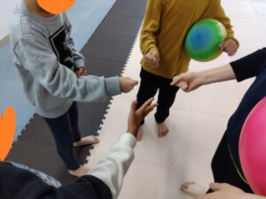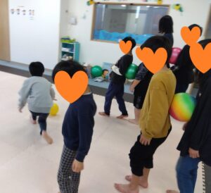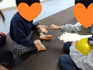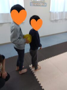 2人で並び、真ん中にボールを挟み協力して運びます☆彡