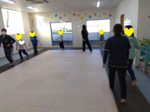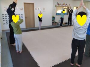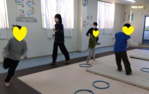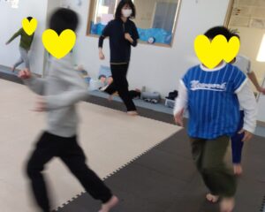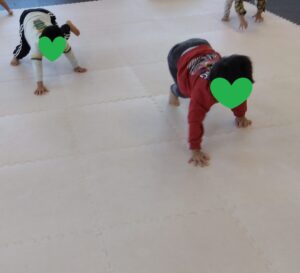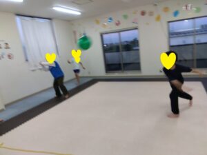 走ったりしながらも、「反対周り」「後ろ走り」など💦よ~く聞いてお友達は抜かさないように!足をしっかり上げて、腕を振って走りましょう♬沢山走っって最後のポーズは…エントツのポーズ10秒!!!フラフラしそうになりながらも、しっかり止まってポーズできたお友達もいました💮