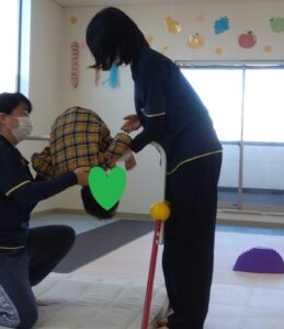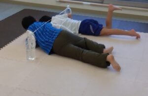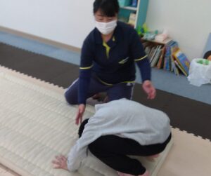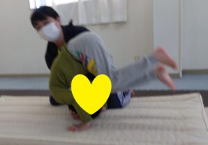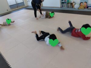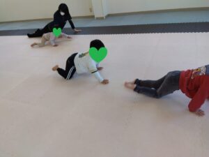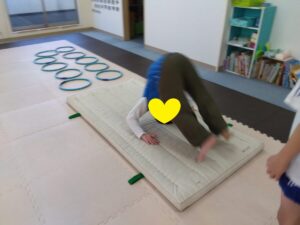 前転は1回目も2回目も順番を譲り合って1人ずつです