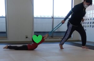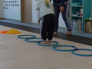 前転→フープジャンプ→ゴム跨ぎ・くぐり・ジャンプ→前転→ポーズの順番で2人で譲り合っていきましょう