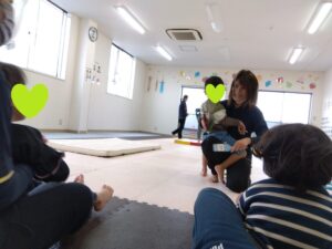 あれ、先生のお膝の上で手遊びしているお友達がいるよ🙄
