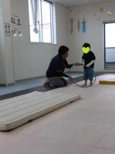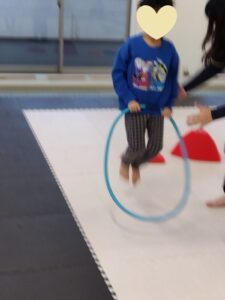 大きめのフープを使って、縄跳びをしました。