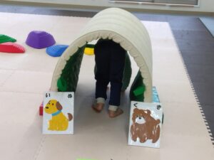 フープをくぐって変身!!!トンネルの前に変身用の動物さんがいるのでよく見ていきます!