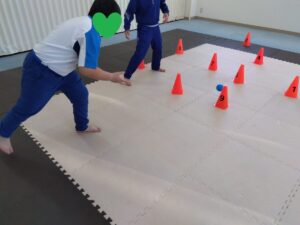 今日は2人組になって 仲良くボール運びをしましょう