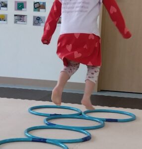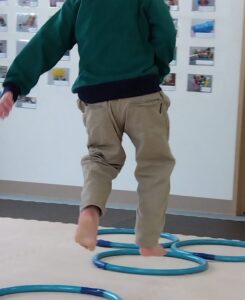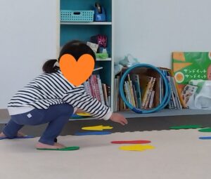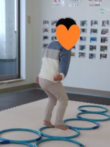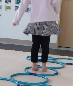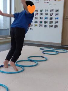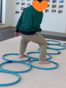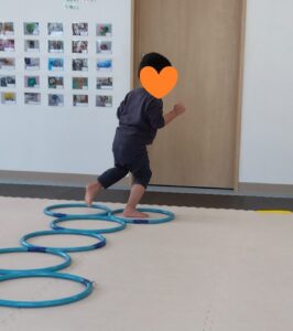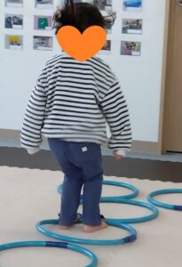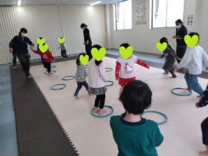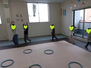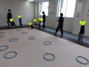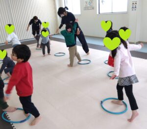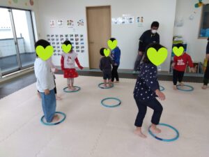 フープの中に入るときには、お友達に「ここあいてるよ!」
