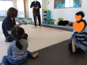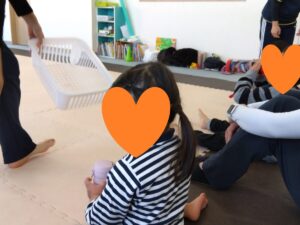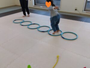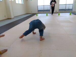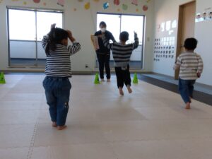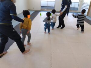 タンバリンの音に合わせて♬走ったり、後ろ歩きやポーズをしたりスキップしたり…お友達にぶつからない様に楽しむ事が出来ました🌼