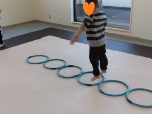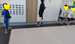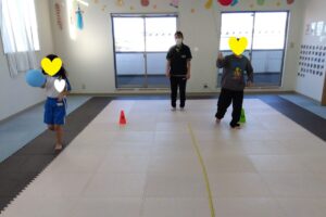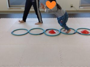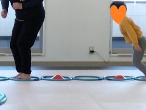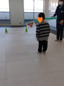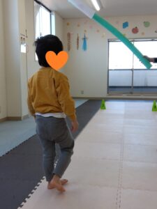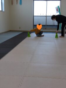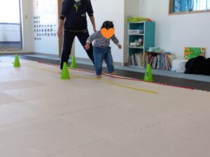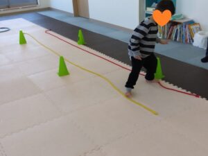 線の上を歩いて、コーンをタッチしながら進みました!