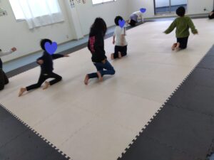 前を向いて動物カードを探し、その動物で進んで行きます。何に変身したら良いか分からないとき、周りがどんな動物に変身しているのを見て動きました