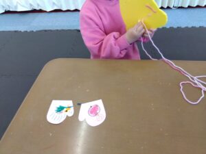 帽子は指先を使って、小さい穴に毛糸を通して…アミアミしていきます