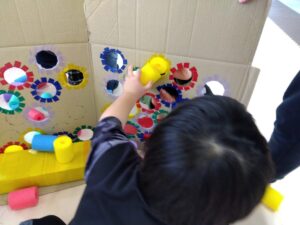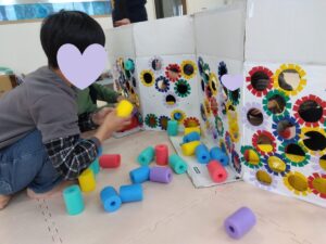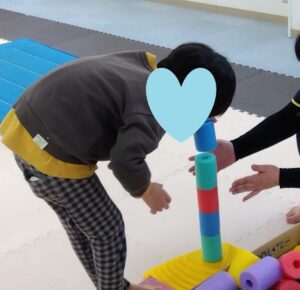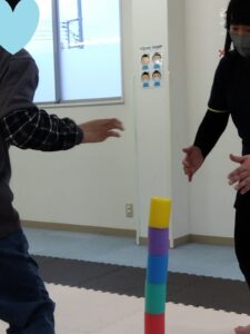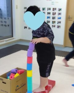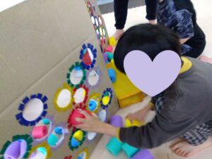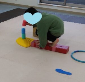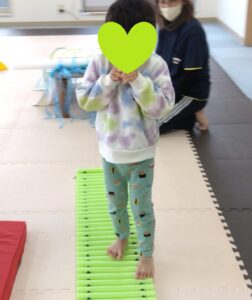 平均台の上に乗りながら、プールスティックを乗せていきます。