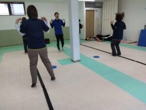 「あたま・かた・クロス」🎵のリズムでジャンプしながら、手を頭、肩に手を動かし、その後両手をクロスする動きをしていきます。