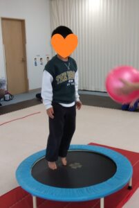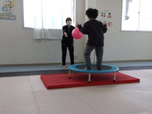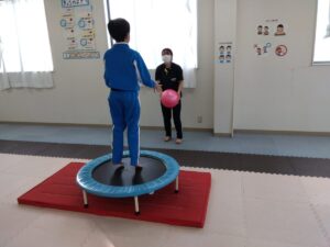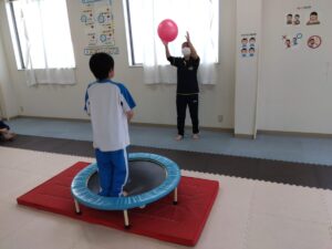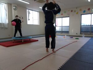 トランポリンでジャンプしながらキャッチボールを