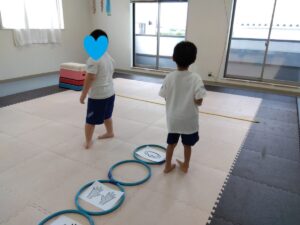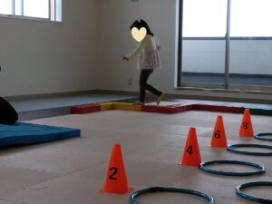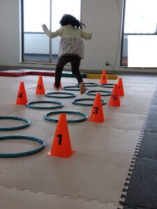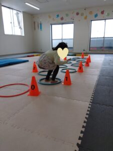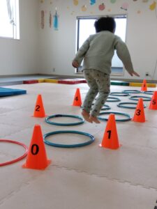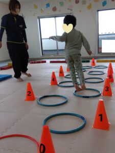 ジグザグにフープをジャンプして、コーンをタッチしていきます✋