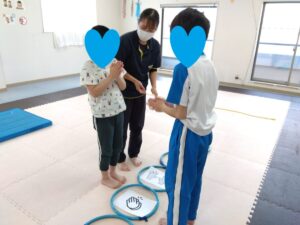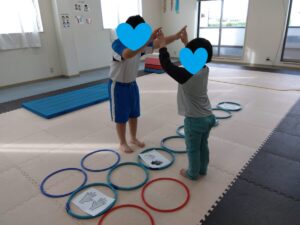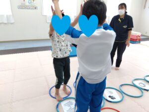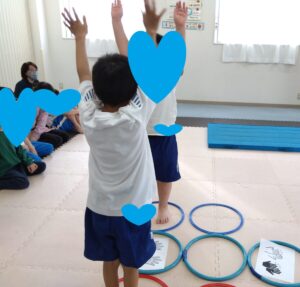 フープの上にある紙を見て、バンザイ・拍手・回る・ハイタッチと