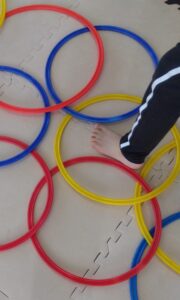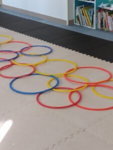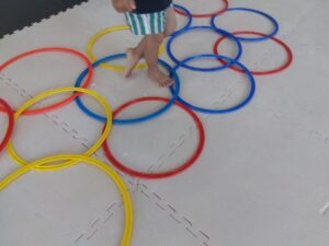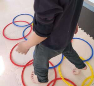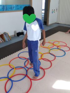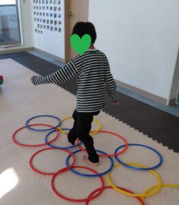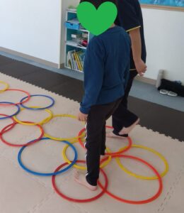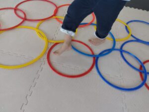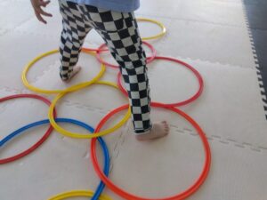 重なっているフープのすきまを歩いて進んで行きます!